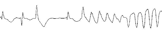 Polymorphous ventricular tachycardia (Torsade de pointes).